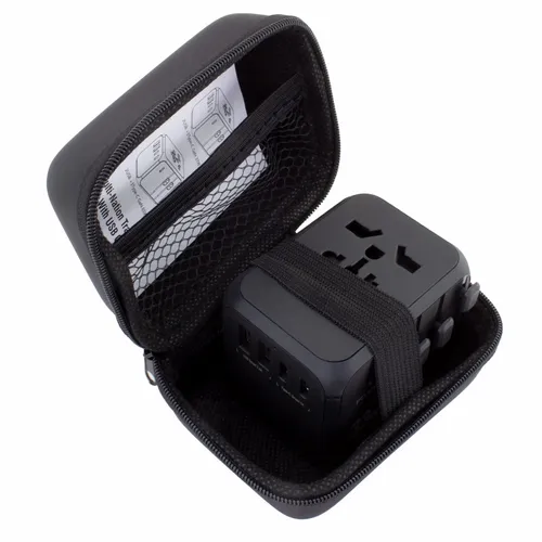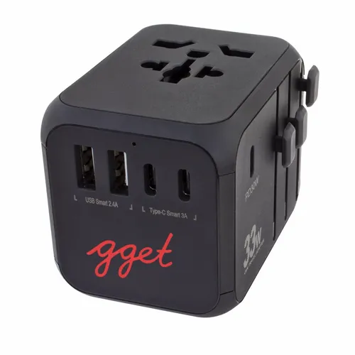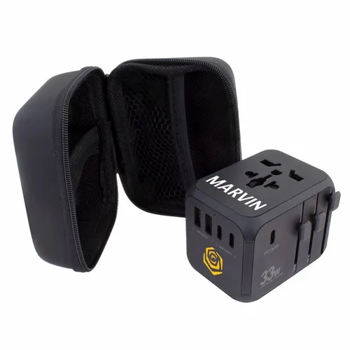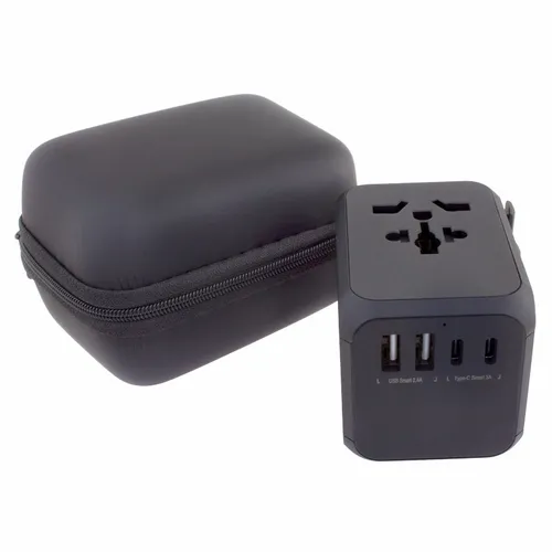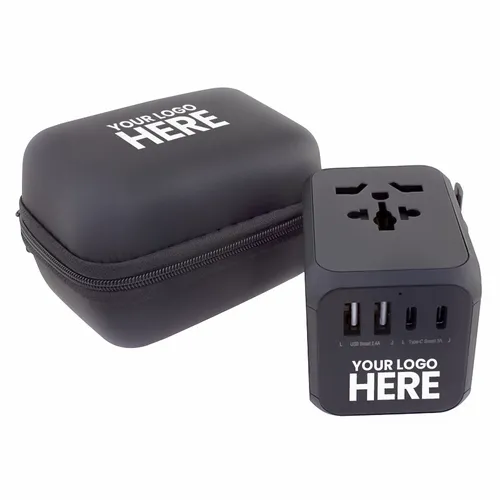 A travel adapter that is perfect for teams that need to travel often for business. Comes with Type-C ports and two USB ports that allow you to charge multiple devices simultaneously. Features: Covers more than 150 countries with US/EU/UK/AUS plugs Built-in safety shutters protect users from the direct touch of the live parts on the socket outlet Only one plug-type can be used at one time by sliding the knob selection, other plug-pins are locked automatically