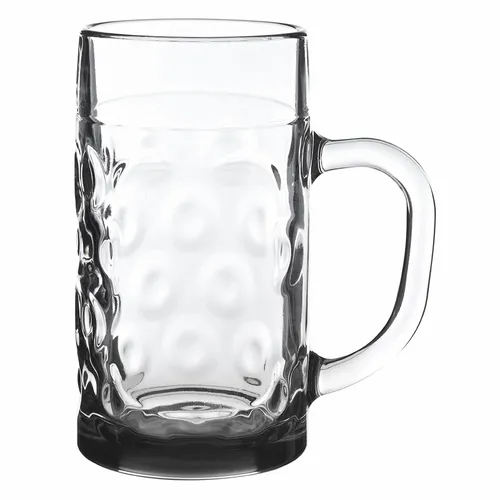 Oktoberfest Inspired Large Beer Glass. Traditional Dimpled Shape Design . Thick Handle. Holds 40.5 ounces. Made in the U.S.A.. Recommended Hand Wash Only