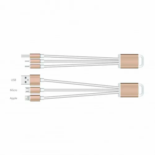 The perfect companion to the stylish tech enthusiast. With the elegant metallic design and durable braided cables this charging cable adds elegance to utility and can be engraved for a subtle refined style or imprinted with color to give your client's logo pop! The cable includes USB, MicroUSB, and 8-pin style tip to cover most Android and other devices.