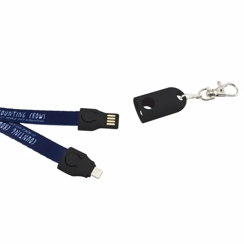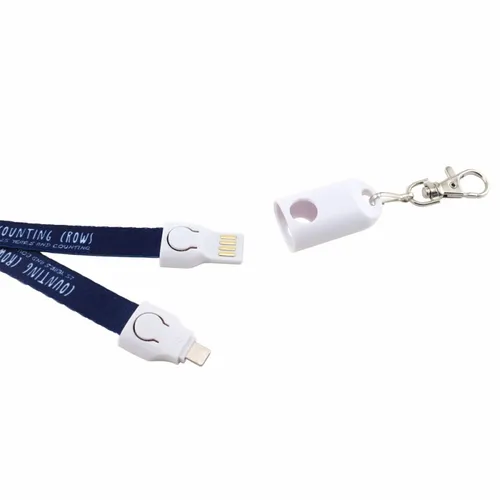 The perfect item for conventions, trade shows, and sporting events! The Fabric Lanyard Charging Cable provides a comfortable strap to keep your badge, keys, etc on your neck. Simply detach the keychain clip and the lanyard becomes 3' charging cable that is compatible with most Android and other devices. The 3' cable is full-color print capable to clearly display your client's logo!