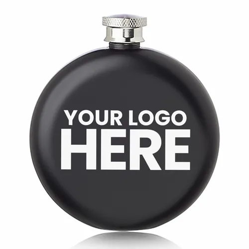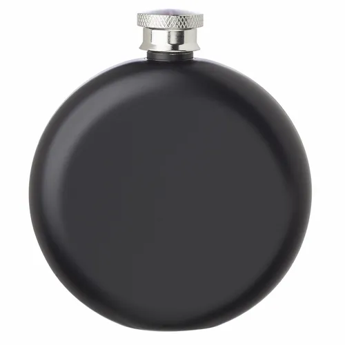 5oz. Stainless Steel Hip Flask. Round Shaped Single Wall Construction. Comes in Matte Black or a Mirror Silver Finish. Stainless Steel Screw-On Lid
