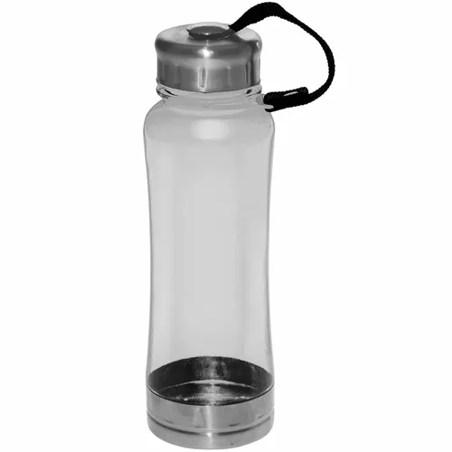 23oz. Bold Translucent Curved Hard Plastic Sports Bottles. Pressed Metallic Design Screw-On Cap. Stylish Pressed Metallic Base Accent. Attached Canvas Mesh Safety Threaded Leash. Recycle Plastic #7. BPA Free