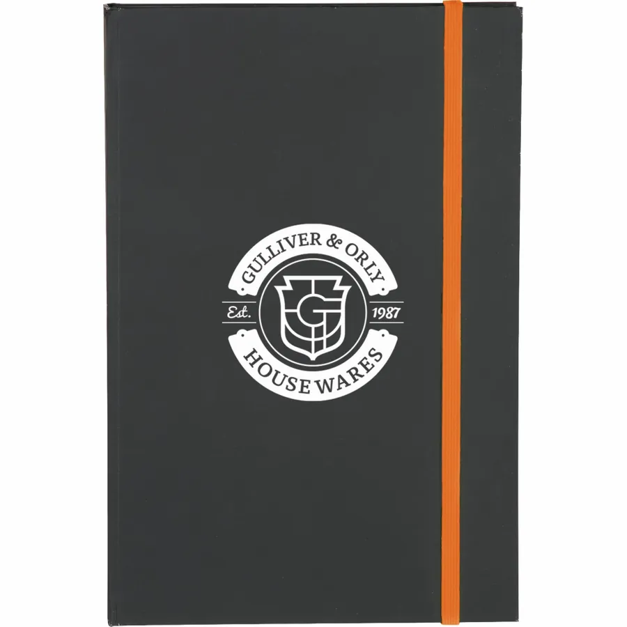 The 5.5 x 8.5 FSC Mix Color Pop Bound Journal features a hard cover with a soft matte black cover to highlight the most subtle or colorful logos. This custom Journal includes 96 sheets of FSC Mix cream lined paper with bright colored edges and corresponding color elastic closure.