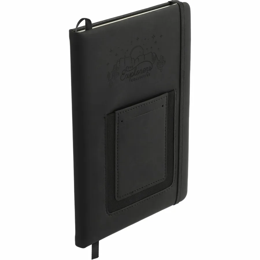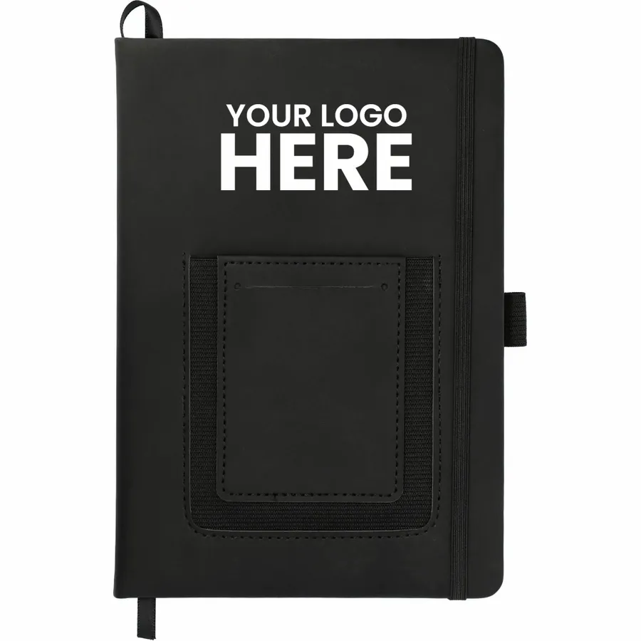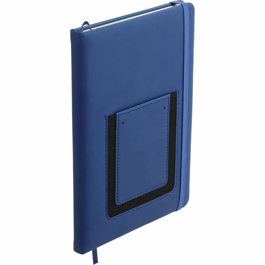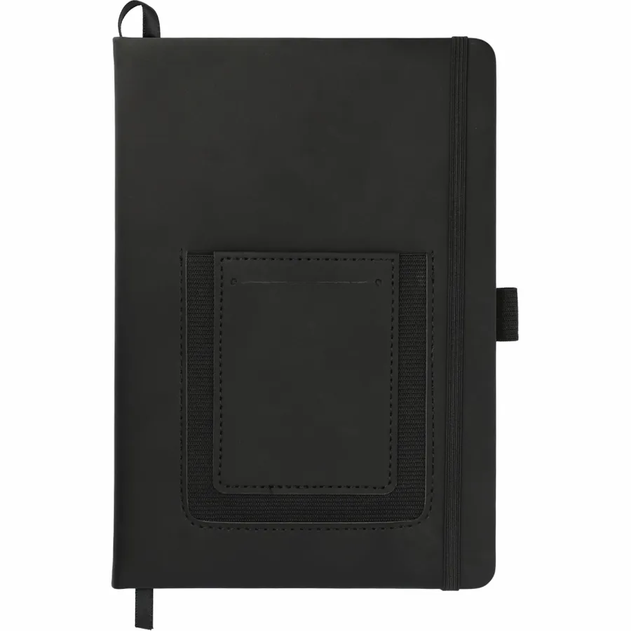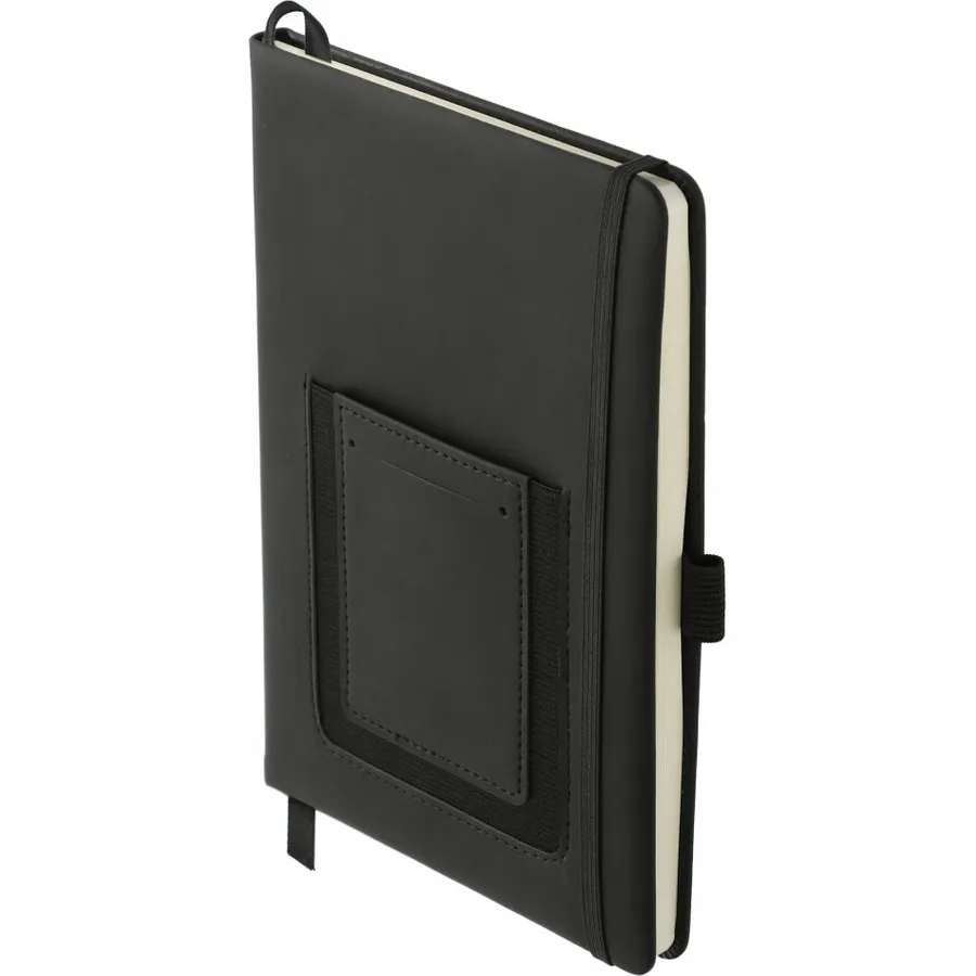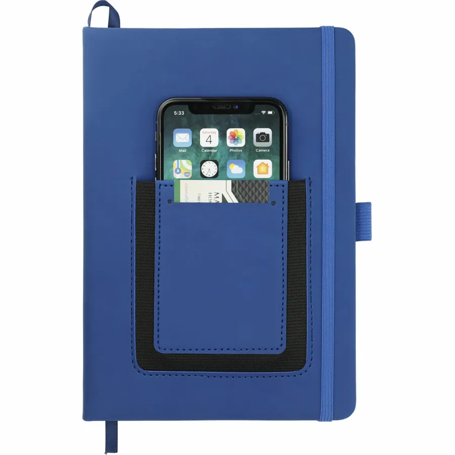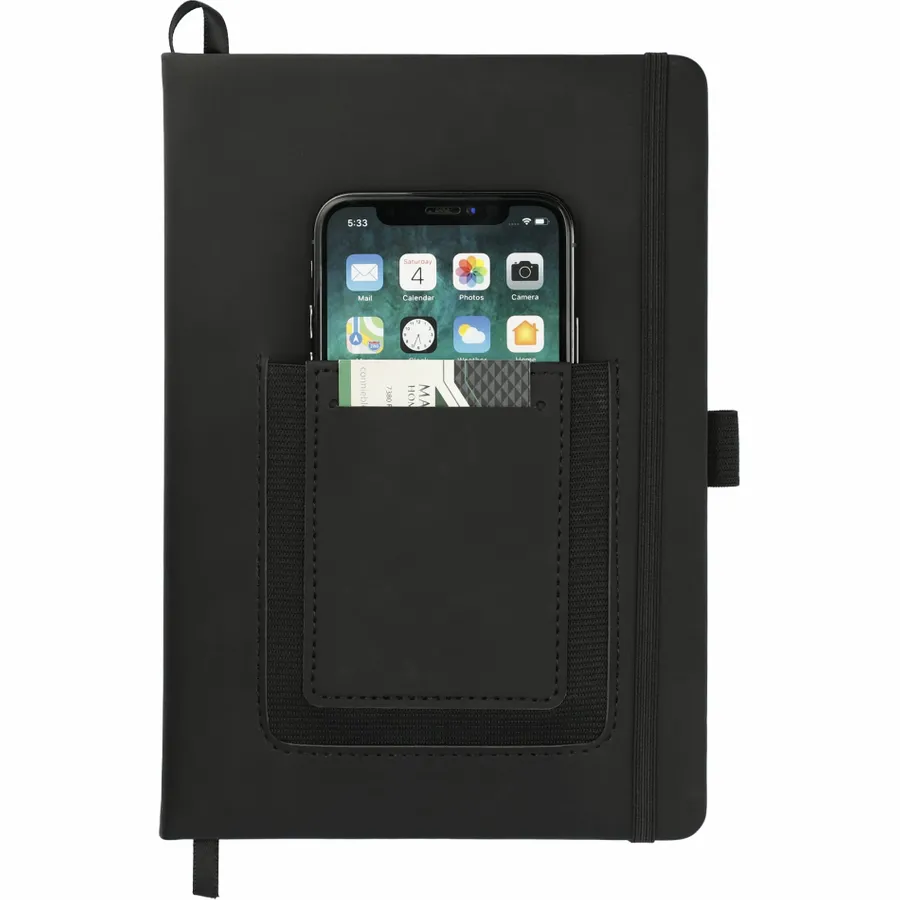 The 5.5 x 8.5 FSC Mix Vienna Phone Pocket Bound Journal features a smooth PU, hard cover and a front phone pocket with business card slot. Includes a color matching elastic closure, ribbon page marker and 80 sheets of FSC Mix cream lined paper.