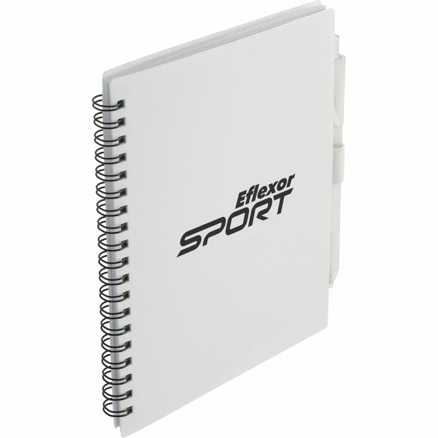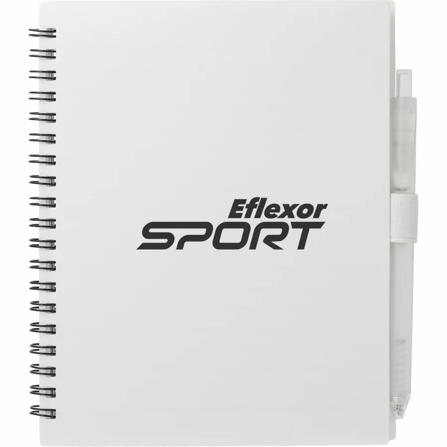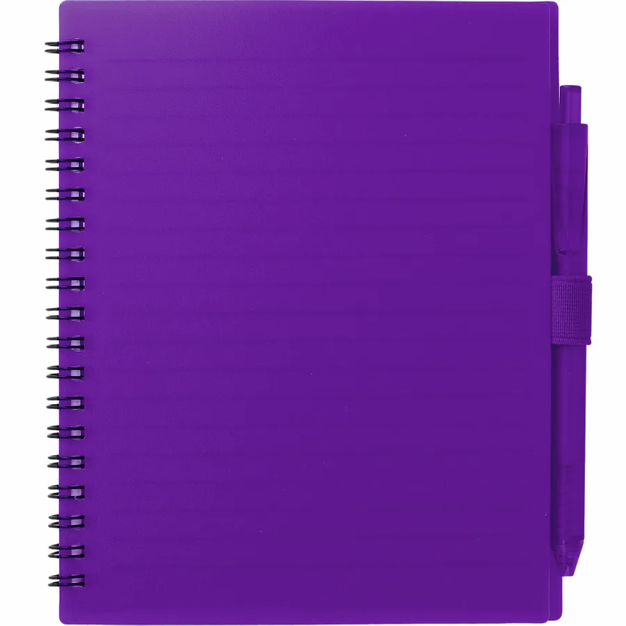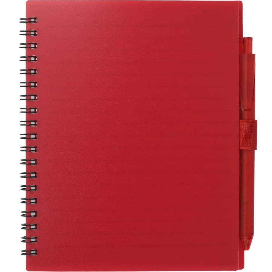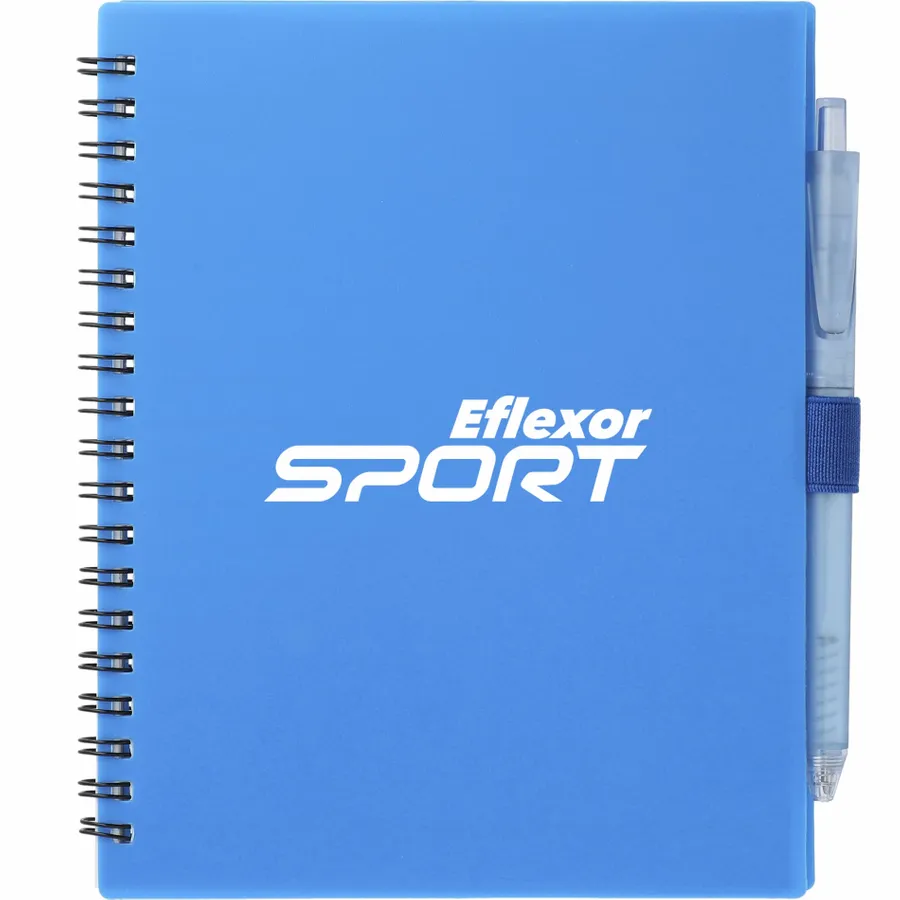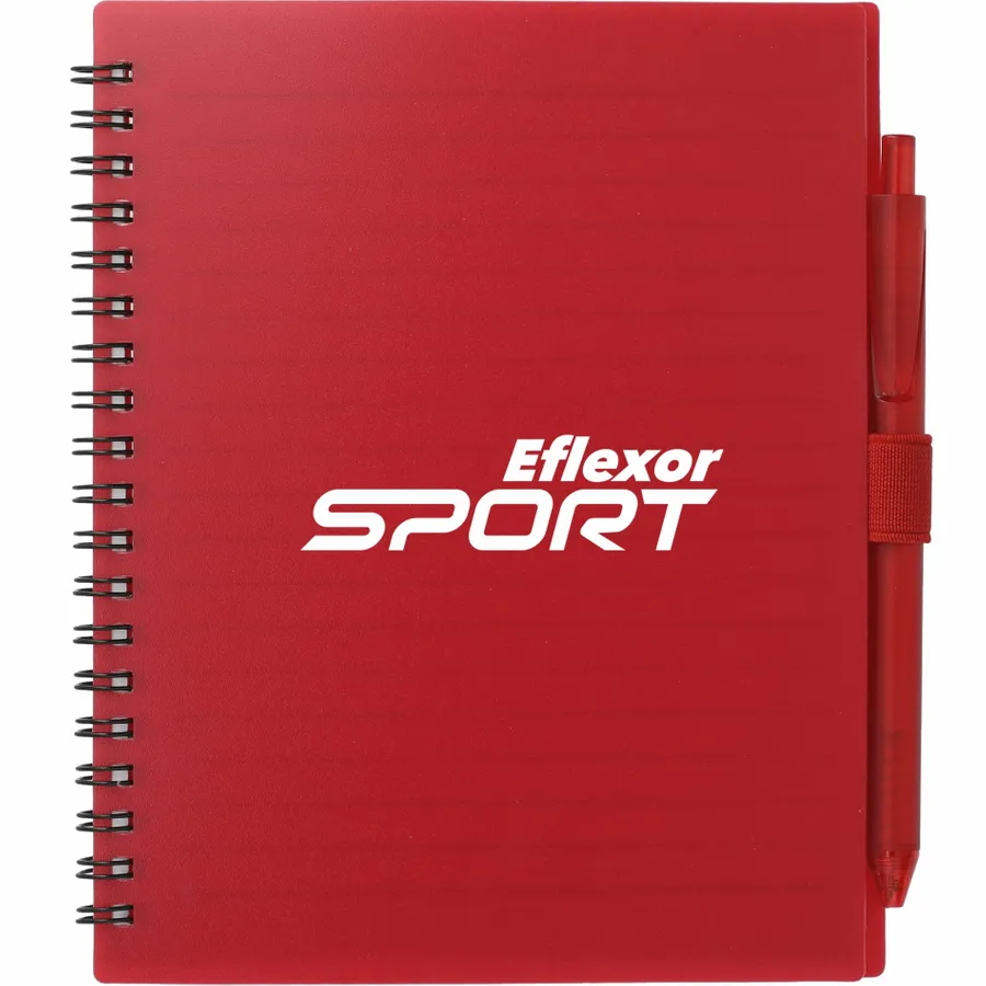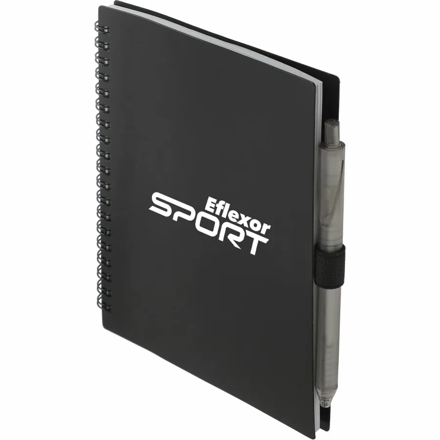 The 5.5” x 7” FSC Recycled Spiral Notebook with RPET Pen features a 100% recycled polypropylene, hard cover with 70 sheets of white lined FSC-certified paper. Black metal wire binding paired with black elastic pen loop. Includes 100% RPET barrel pen with black ink cartridge. Through a partnership with 1% For The Planet, one percent of sales of all EcoSmart products are donated to environmental nonprofits. Note that pens are packed separately.