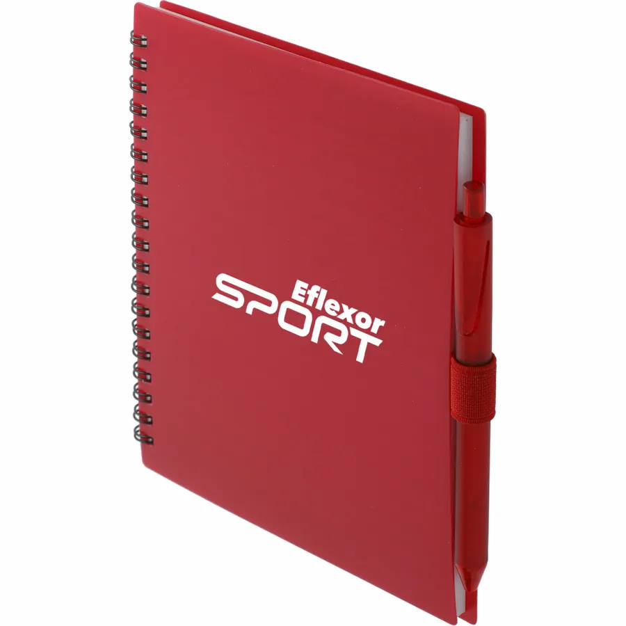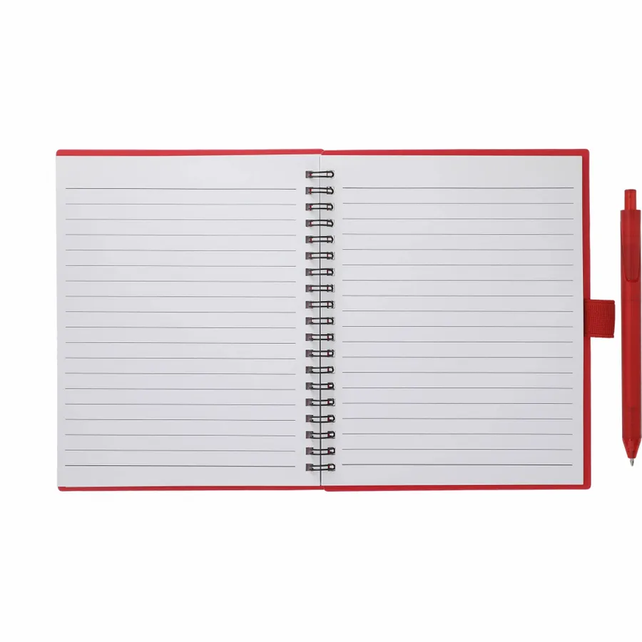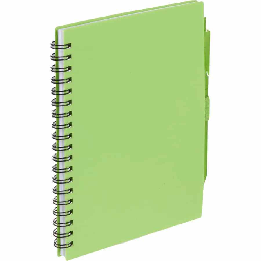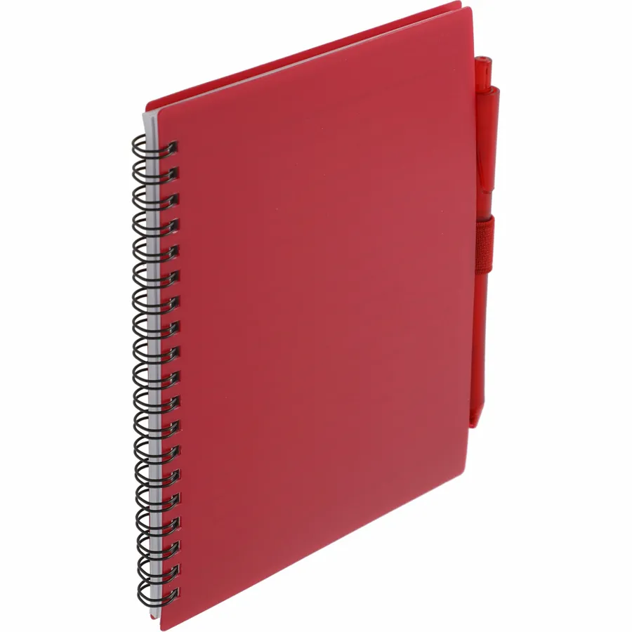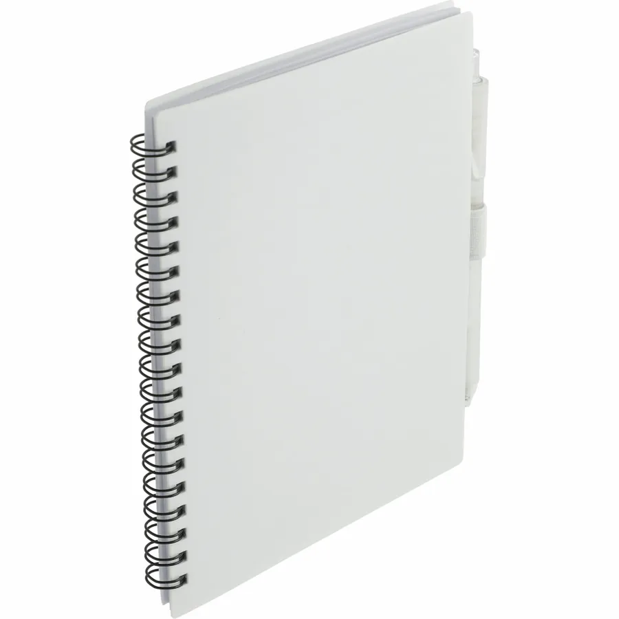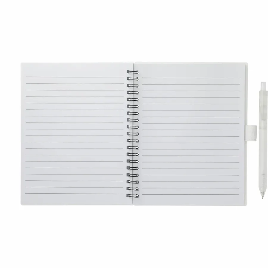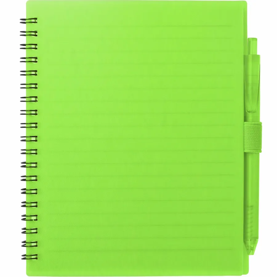 The 5.5” x 7” FSC Recycled Spiral Notebook with RPET Pen features a 100% recycled polypropylene, hard cover with 70 sheets of white lined FSC-certified paper. Black metal wire binding paired with black elastic pen loop. Includes 100% RPET barrel pen with black ink cartridge. Through a partnership with 1% For The Planet, one percent of sales of all EcoSmart products are donated to environmental nonprofits. Note that pens are packed separately.