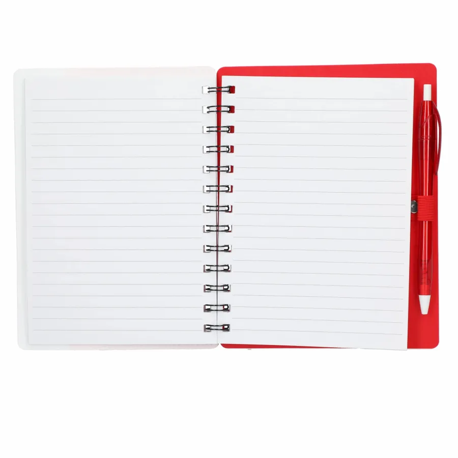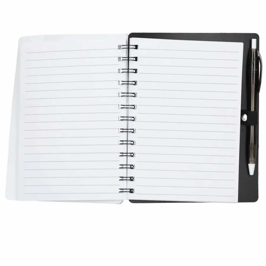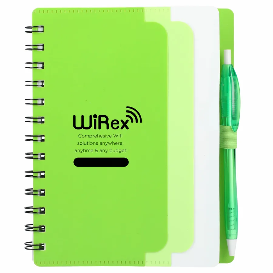 Discover the eco-conscious choice with the 5 x 7 Recycled Dual Pocket Spiral Notebook with Pen. Its 100% recycled PP cover includes dual front pockets for document storage, all within a practical spiral design. Featuring 70 sheets of recycled white lined paper, a color-matching pen loop, and an RPET color matching pen with smooth black ink, click action, and a 1mm tip providing 600 meters of writing length. As part of our commitment through 1% For The Planet, one percent of sales from all EcoSmart products contribute to environmental nonprofits. Opt for sustainability in your note-taking. Note that pens are packed separately.