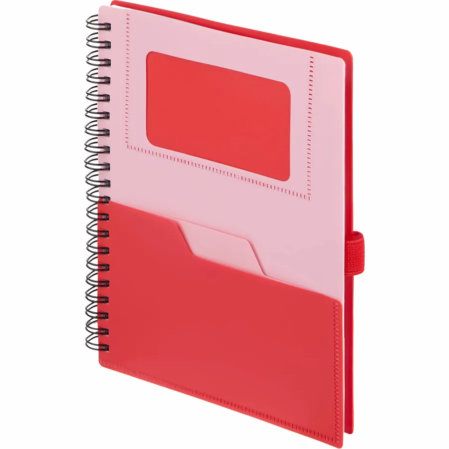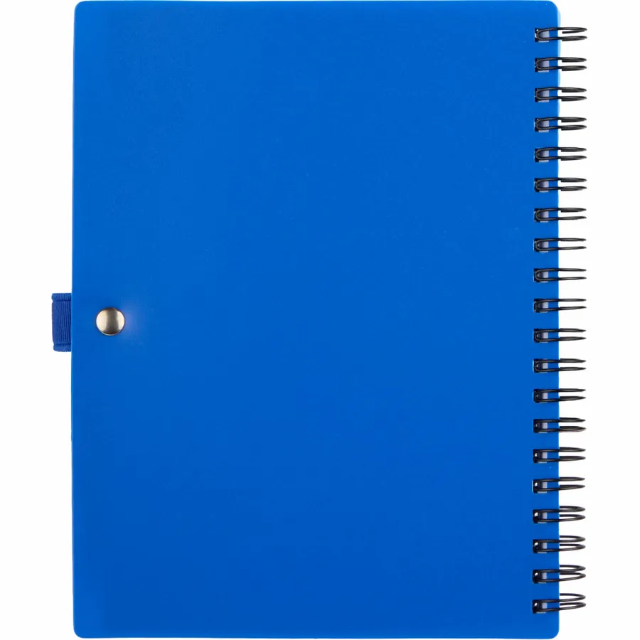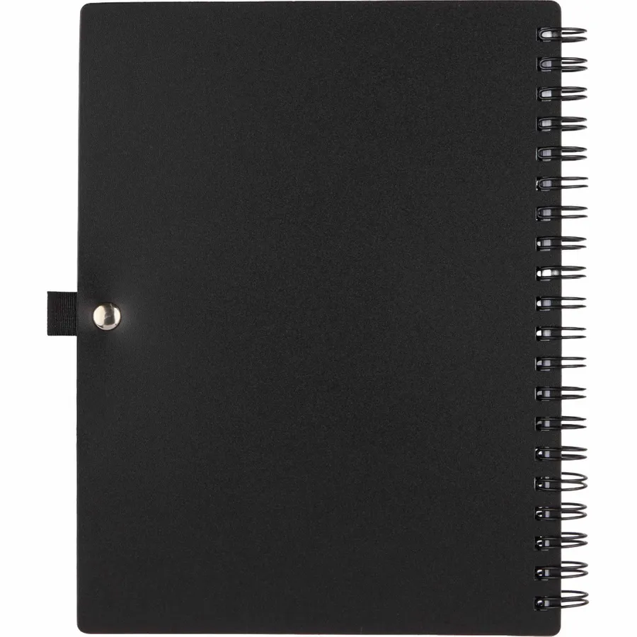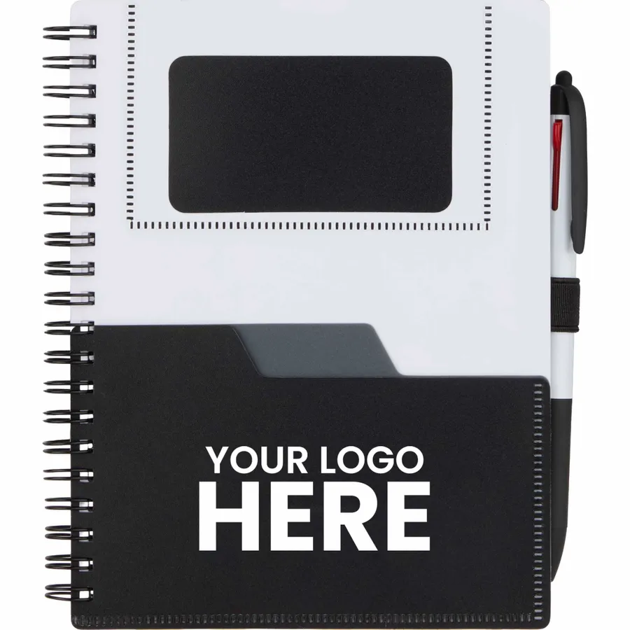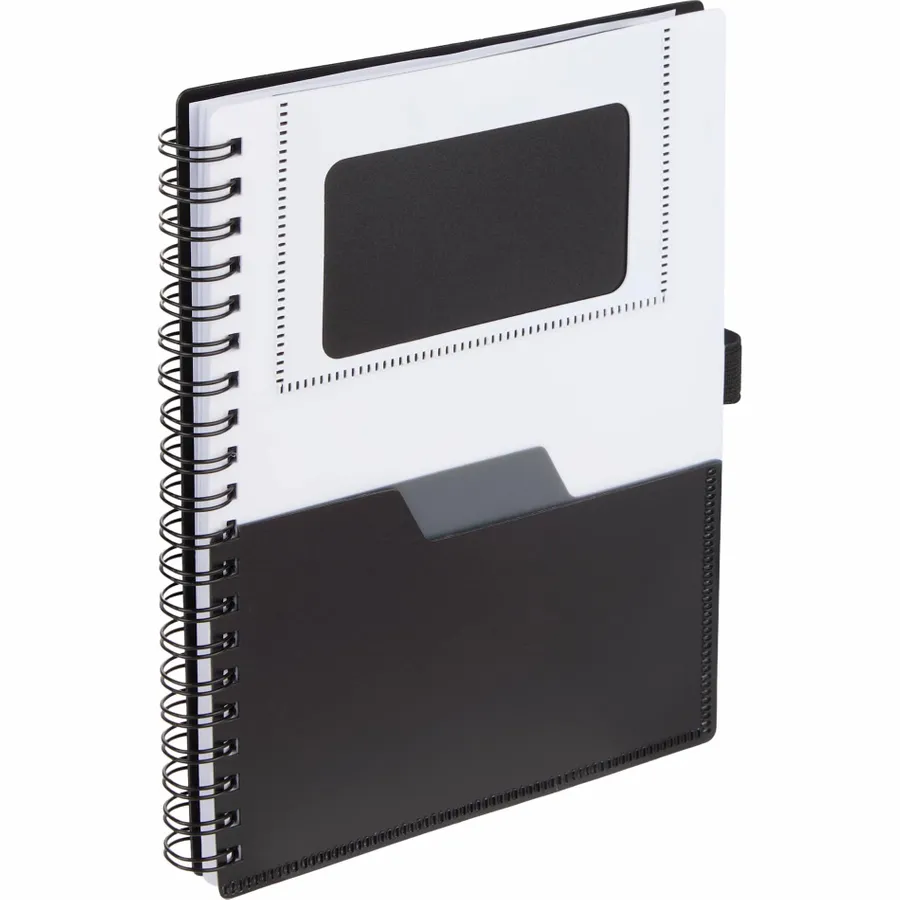 The 5 x 7 FSC Recycled Stash Spiral Notebook keeps notes tidy and accessible. Its durable 100% recycled PP cover includes two front pockets and a business card slot, plus a matching pen loop. The spiral binding lays flat for comfortable writing across 80 sheets of FSC recycled paper—ideal for meetings, classes, or daily journals. By choosing this notebook, youre making a positive impact on the environment, as one percent of sales are donated to environmental nonprofits through a partnership with 1% For The Planet.