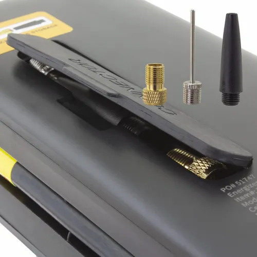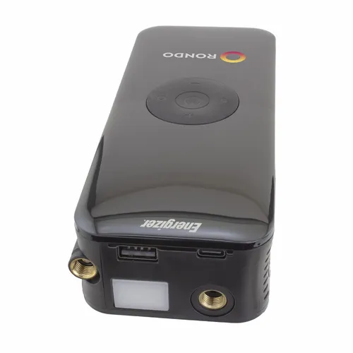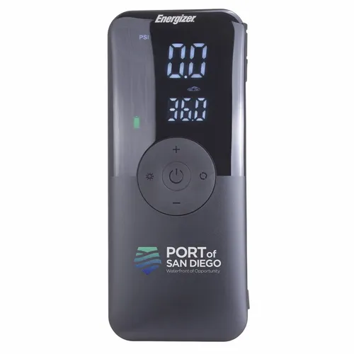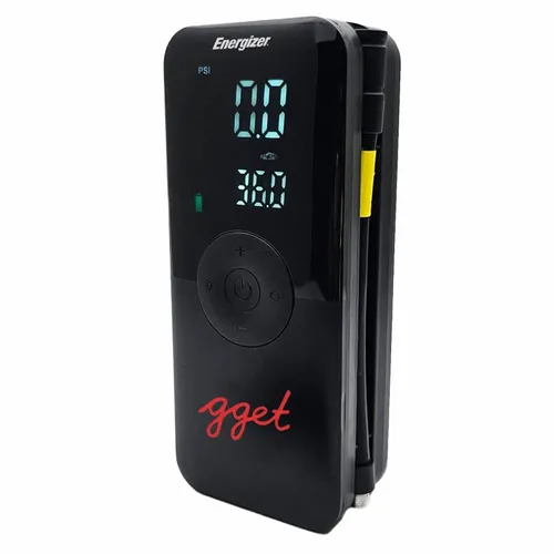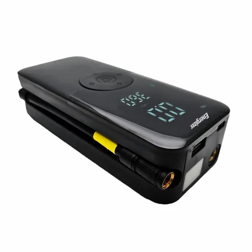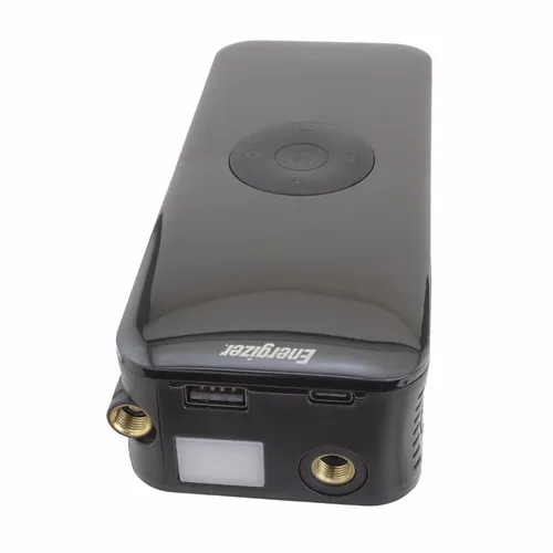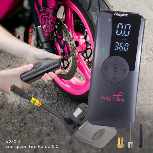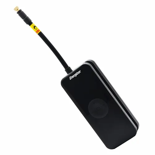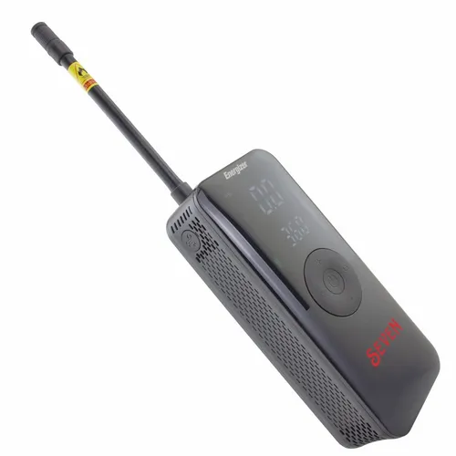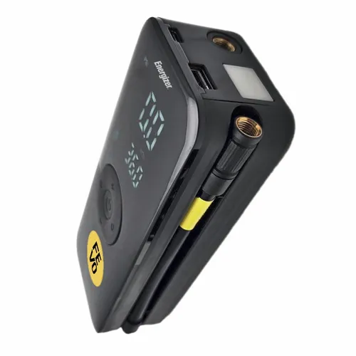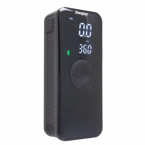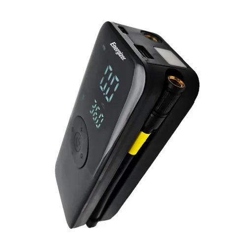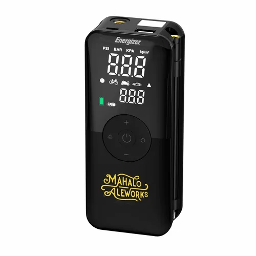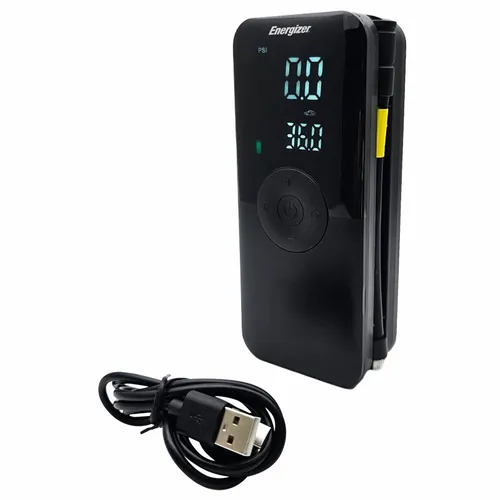 A portable and rechargeable electric tire pump with a large easy-to-view LCD display. It has five inflation modes: automotive, motorcycle, and bicycle tires as well as a setting for sports balls. It also functions as a power bank with a USB output port located on top. Recharge the air pump's built-in lithium battery via its Type-C input port. It is packaged with a compact attachable air hose and a Type-C cable. AC wall adapter not included.