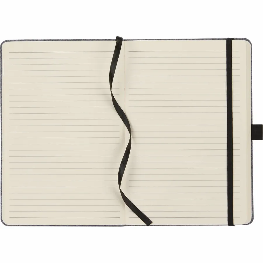 THE GOODS™ recycled felt collection uses a durable on-trend material to let your brand shine. THE GOODS™ 8 x 5.5 Recycled Felt Bound Notebook features an eco-friendly, 100% recycled PET felt fabric cover. Includes 80 sheets of recycled cream lined paper, back document pocket, ribbon page marker, elastic closure, and pen loop. Pen is not included. By choosing this notebook, youre making a positive impact on the environment, as one percent of sales are donated to environmental nonprofits through a partnership with 1% For The Planet.