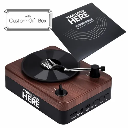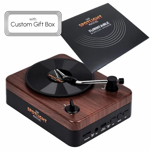 - Turntable Wireless Speaker with Custom Record Envelope and Custom Gift Boxs